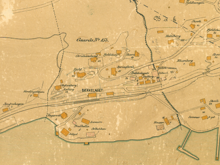 Kart fra 1893. Kneppe eller lille Bekkelaget var området mellom de 2 bekkene som randt ut i fjorden her.