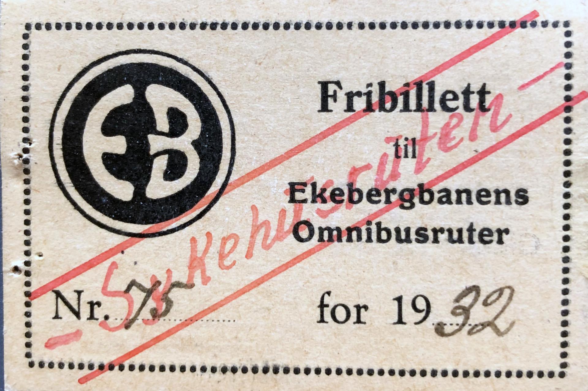 Eksempel på en fribillett som tilhørte hustruen til en ansatt sjåfør i Ekebergbanen.